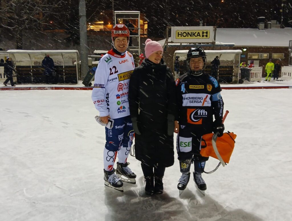 Päivän otteluisäntä Ese-Energia Oy palkitsi joukkueidensa parhaina pelaajina Narukerän Ville Aaltosen ja Kamppareiden Sami Mikkolan. Raadissa yhteyspäällikkö Mervi Pajunen (kuvassa keskellä), mittausinsinööri Antero Levänen sekä markkinointi- ja viestintäasiantuntija Mari Harlin.