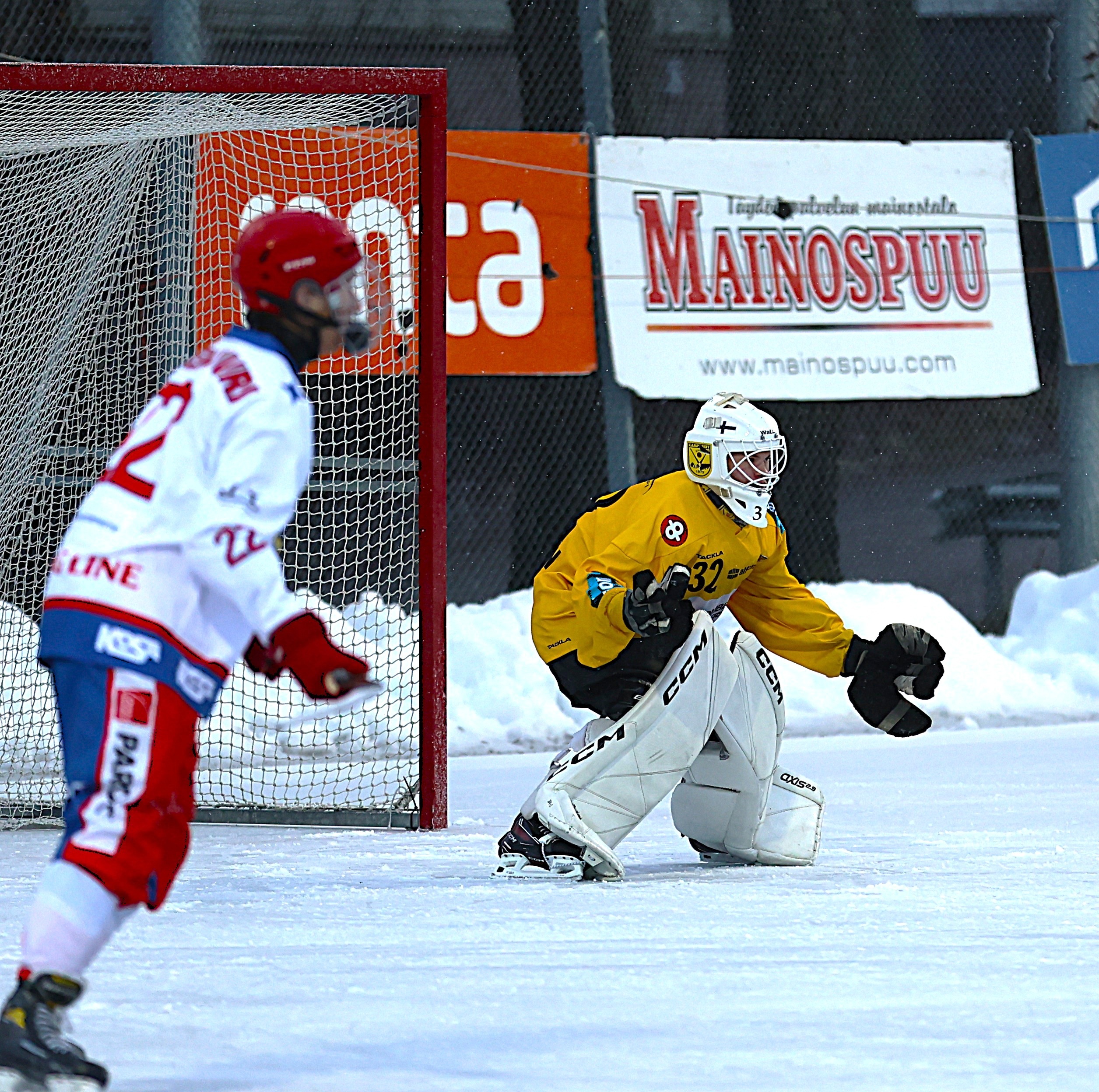 Iivo Korhonen torjui kampparimaalilla sunnuntaina mallikkaasti. Syksyn tuttu sää, räntä, ja pehmeä jää jarruttivat Kampparien vauhtia jälleen kerran.