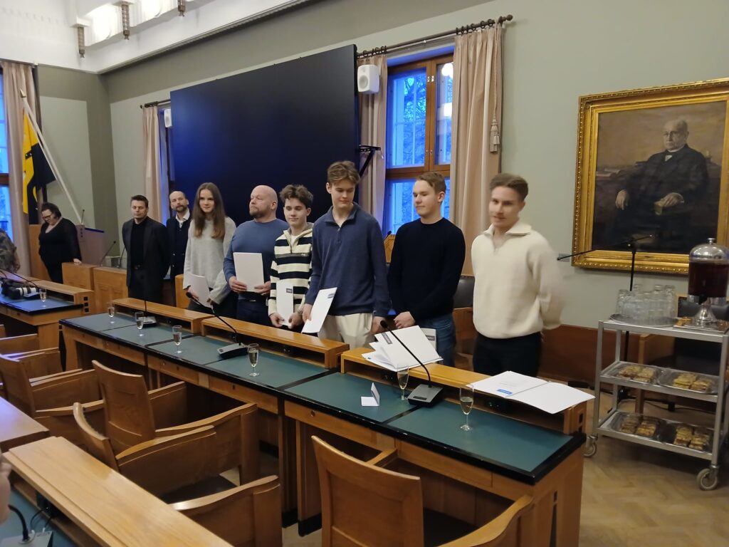 Kuvassa Mikkelin Kaupungin puolesta palkinnot jakaneet Anu Kokkonen, Jarno Strengell ja kaupunginjohtaja Janne Kinnunen sekä paikalle päässeet Jenna Kastevaara, Joonas Immonen, Paavo Tapio, Viljami Kumela, Jere Immonen ja Simo Huotelin.